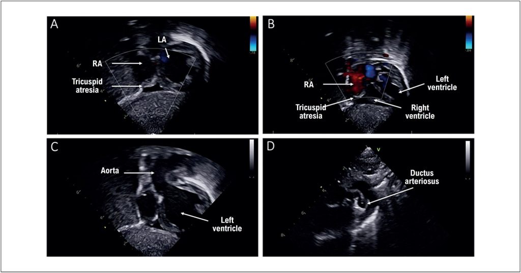 Tricuspid atresia with pulmonary atresia is a rare congenital heart defect, representing about 1% to 3% of all congenital heart diseases. Tricuspid atresia is subdivided into type I (normal position of the great arteries) and type II (transposition of the great arteries), with type 1A characterized by the presence of associated pulmonary atresia or stenosis. Pulmonary blood flow in these patients is dependent on the patency of the ductus arteriosus, making its maintenance essential in the neonatal period.
