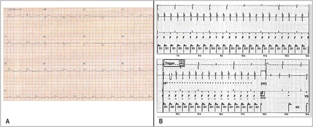 (A) Complete atrioventricular block. (B) Telemetry record of the device showing an episode of ventricular tachycardia (approximately 300 ms/200 bpm cycle) with effective therapy.