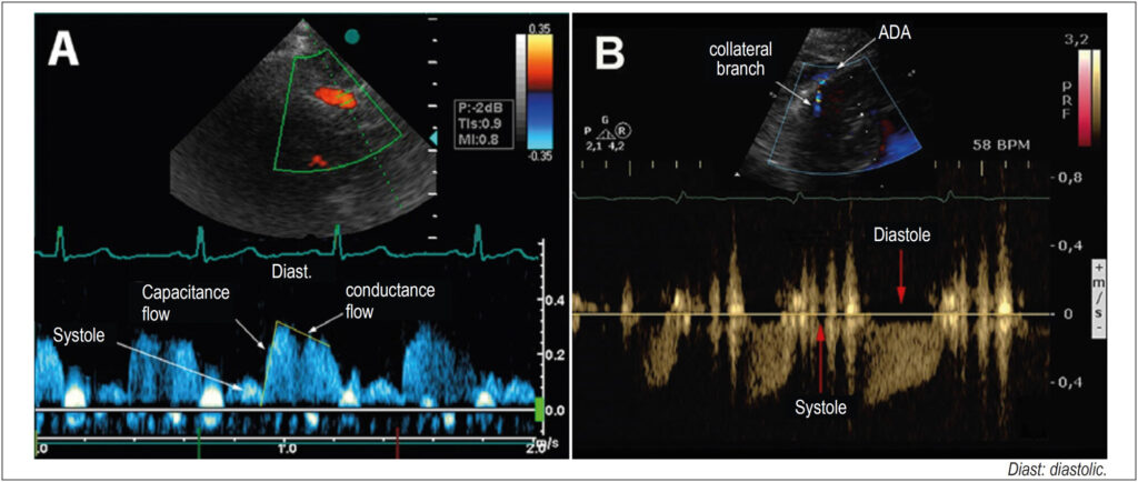 Coronary flow with a diastolic predominance increases two to five times in hyperemia, mediated by vasodilation (coronary flow reserve, CFR) and, in hypertrophy, relative ischemia may occur. In secondary hypertrophy (LVH), the flow, normal at rest, becomes ischemic due to increased demand. In hypertrophic cardiomyopathy (HCM) with perivascular fibrosis, collateral vessels appear to increase the irrigation of hypertrophied segments.