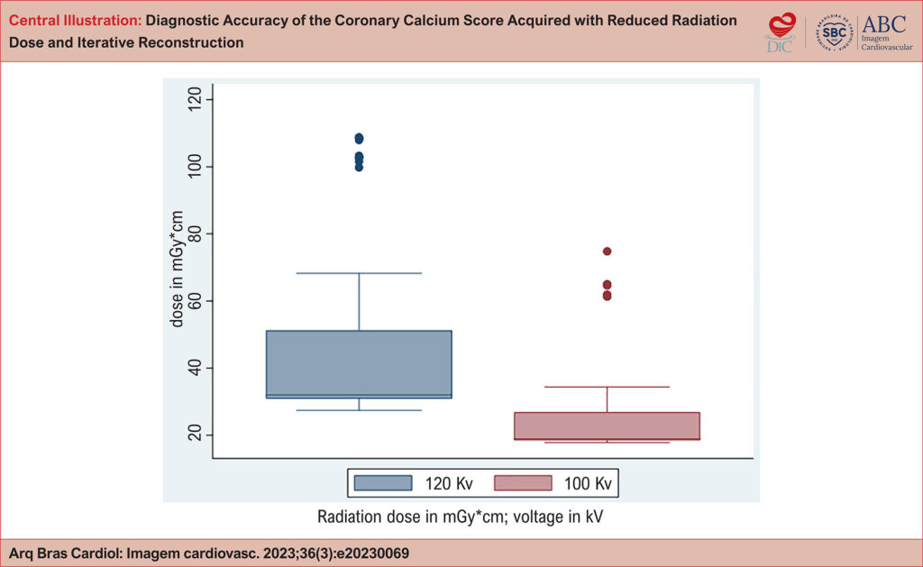 This was a cross-sectional, observational study with patients over 18 years of age. Patients with previous coronary artery disease and patients who declined to participate were excluded. We acquired calcium score twice (120 kV and 100 kV) with different iterative reconstruction techniques. Two professionals interpreted the exams.