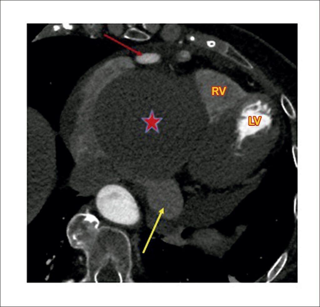 Coronary artery aneurysm (CAA) is defined as a dilation that exceeds the normal diameter of the adjacent artery or the diameter of the patient’s largest coronary artery by 1.5 times. Some authors consider a giant coronary aneurysm when the diameter is > 20 mm, whereas the American Heart Association defines giant aneurysms as those > 8 mm. Giant CAA is a rare pathology with an approximate incidence of 0.02%. We report a case of giant right coronary artery aneurysm with fistula to the coronary sinus, appearing as a giant “mass”.
