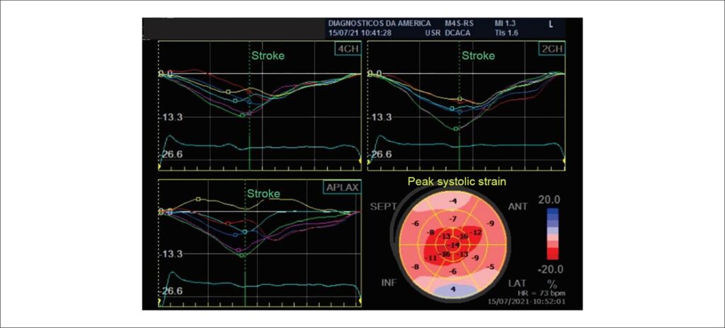 Strain measurement can identify abnormalities in global and regional myocardial function, in addition to making the differential diagnosis of some cardiomyopathies. Furthermore, it is an earlier marker of ventricular dysfunction than ejection fraction and may predict adverse cardiovascular events.