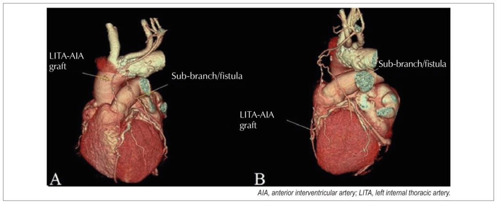 The left internal thoracic artery (LITA) fistula to the pulmonary artery (PA) and/or its branches is a rare condition that was first described in 1947 by Burchell and Clagett and can be acquired or congenital. Its etiologies include, trauma, infection, neoplasms, and mainly myocardial revascularization surgery (MRS)., The surgical manipulation of the intrathoracic vessels during MRS may predispose a patient to postoperative LITA fistulization to the PA, causing coronary flow leakage and myocardial ischemia. LITA should be considered an etiological diagnosis in cases of persistent angina after MRS., Its diagnosis requires coronary cineangiography,– and its treatment options include conservative drug therapy, surgical ligation, or endovascular intervention.