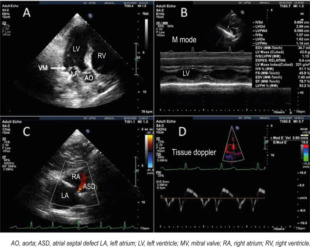 Mucopolysaccharidosis (MPS) belongs to the group of lysosomal storage diseases associated with the partial or total deficiency of 11 different lysosomal hydrolases responsible for glycosaminoglycan (GAG) degradation. GAG accumulation may affect the valves, myocardium, and coronary vessels. The forms that accumulate dermatan sulfate (MPS I, II, VI, and VII) are associated with valvular thickening (L > R). MPS is one of the most common causes of mitral annulus thickening in children. Cardiac involvement also includes hypertrophy, tendinous cord shortening, and papillary muscle thickening. Echocardiography is an essential technique used to assess cardiac involvement in MPS. The study of myocardial strain using two-dimensional speckle-tracking echocardiography (2D-STE) provides a more sensitive evaluation of myocardial fiber strain that can reveal early and subclinical myocardial involvement regardless of left ventricular ejection fraction (LVEF) changes,.