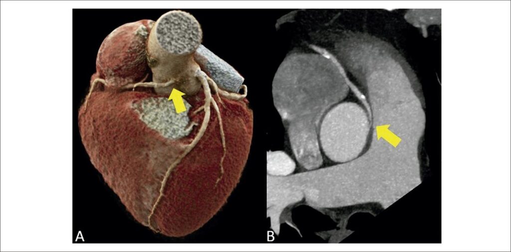 Anomalous origin and course of coronary arteries are rare congenital heart diseases, affecting less than 1% of the general population., Anomalous coronary origin with an interarterial (suprapulmonary) course is characterized by the course of the coronary artery between the ascending aorta and the pulmonary artery trunk, most commonly involving the right coronary artery., Most individuals are asymptomatic, but, among symptomatic patients, chest pain and dyspnea on exertion are the most prevalent complaints. There is also an increase in rates of arrhythmia, sudden death, and acute myocardial infarction., Sudden death is the main complication of this anatomical variant, occurring in approximately 30% of patients.,, In these cases, the narrowing and stretching of the anomalous ostium, mainly during physical exercise and in stressful situations, with consequent reduction in coronary flow, is the substrate for potentially fatal ischemic alterations.,, Since electrocardiogram, in most cases, does not reveal ischemic alterations, diagnosis is generally made through an incidental finding on imaging exams. These exams are of great importance, especially coronary CTA, which, in addition to being a non-invasive exam with high negative predictive value, allows detailed anatomical visualization (angle of the origin, presence of intramural trajectory in the aorta, degree of ostial/proximal luminal reduction) and the correct classification in relation to the pulmonary valve plane (suprapulmonary versus subpulmonary).,,