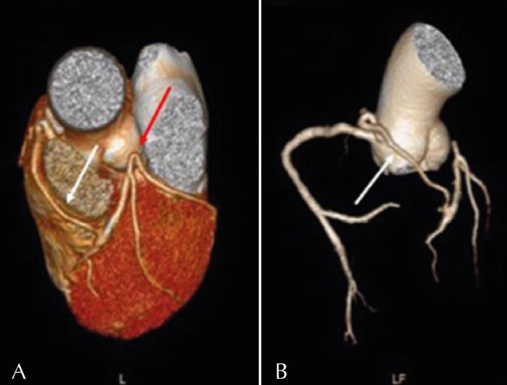 Congenital left main coronary artery atresia (CLMCAA) is a coronary anomaly in which the left coronary ostium or trunk is absent. The anterior descending (AD) and circumflex (CX) arteries are usually connected and proximally end blindly. Left chamber perfusion is provided by the right coronary (RC) collaterals. It is the rarest coronary anomaly, with fewer than 70 cases described in the literature. The clinical CLMCAA spectrum ranges from asymptomatic cases (due to an efficient collateral system) to symptoms such as angina, tachyarrhythmias, syncope, and sudden death., Surgical revascularization is recommended in symptomatic patients; however, preventive surgical treatment is controversial in asymptomatic patients without inducible myocardial ischemia.–