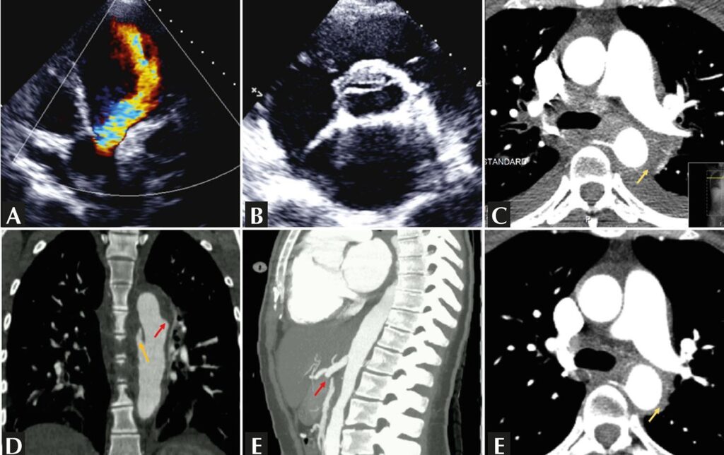 A 21-year-old woman was admitted with heart failure and chest pain. Echocardiography revealed a tricuspid aortic valve with severe regurgitation (A), a thickened and deformed right coronary cusp with a linear image (B), and severe left ventricular dilation. Angio-computed tomography showed continuous and concentric thickening of the aortic wall (C) with a penetrating ulcer and dissection of the descending aorta (D) and superior mesenteric and left renal arterial occlusion (E). Takayasu aortitis type V was assumed for which immunosuppression was commenced. Significant improvement was noted (F). After achieving remission, the patient underwent endovascular surgery of the aorta and aortic valve replacement. No episodes of relapses were seen during a 3-year follow-up period.