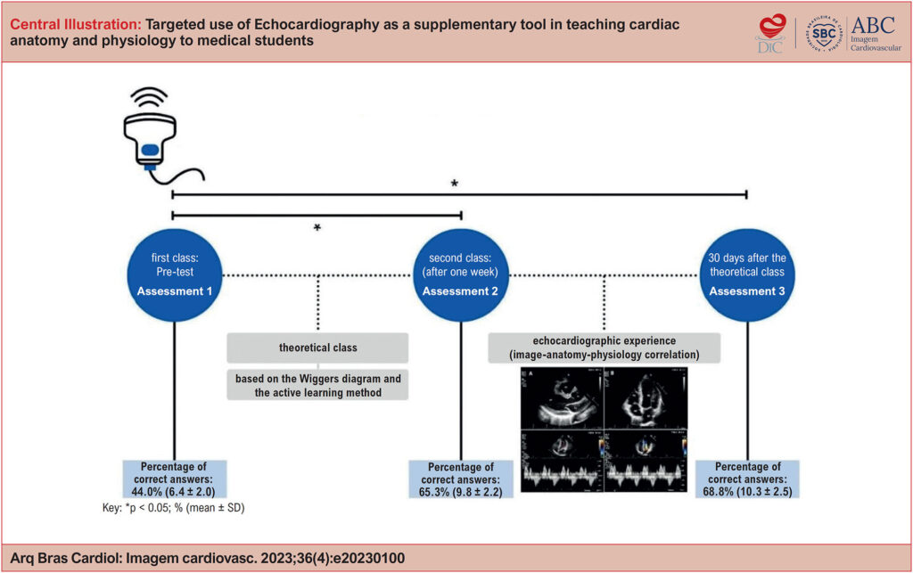 Thirty-four (34) students in the third semester took a pre-test (assessment 1) consisting of 20 multiple-choice questions, 15 of which were related to cardiac anatomy and physiology and 5 were “confusion-inducing questions.” The test was designed by one of the authors, blind to the others. After the theoretical meeting, assessment 2 was carried out with the same questions. The following week, a practical echocardiography meeting was held, aimed at evaluating anatomy and physiology. A post-test (assessment 3) was carried out 30 days after the first meeting to assess knowledge retention. The variables were analyzed by the Kolmogorov-Smirnov, Student’s T, and Wilcoxon tests, with a statistical significance level of p < 0.05.