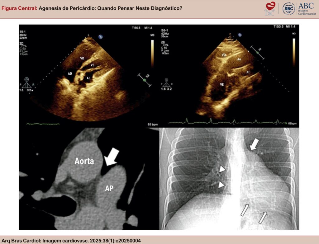 Almeida,Bruna Barbosa Chagas de and Jácome,Bruna Zanforlin and Lourenço,Bernardo Nascimento and Seixas,Alessandro Zakhia de and Silveira,Juliana Serafim da and Gripp,Eliza de Almeida. Agenesia de Pericárdio: Quando Pensar Neste Diagnóstico?. Arq Bras Cardiol: Imagem cardiovasc [online]. 2025, vol. 38, n. 1, [cited 2026-03-06], e20250004. Available from: <https://www.abcimaging.org/pt-br/article/agenesia-de-pericardio-quando-pensar-neste-diagnostico/>. ISSN .