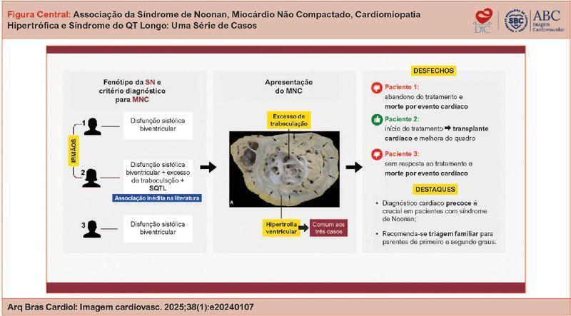 A síndrome de Noonan (SN) é uma doença genética rara caracterizada por manifestações como baixa estatura, pescoço alado, micrognatia e hipertelorismo. Embora a SN predisponha a distúrbios cardíacos, como a cardiomiopatia hipertrófica (CMH), sua associação com o miocárdio não compactado (MNC) é rara. O MNC é uma anomalia embriológica marcada por trabeculação excessiva e formação de recessos miocárdicos profundos, cuja apresentação clínica varia de assintomática a eventos tromboembólicos graves. Este estudo visa descrever as alterações e os desfechos cardiovasculares em portadores de SN e MNC acompanhados no serviço de cardiologia de um hospital brasileiro.