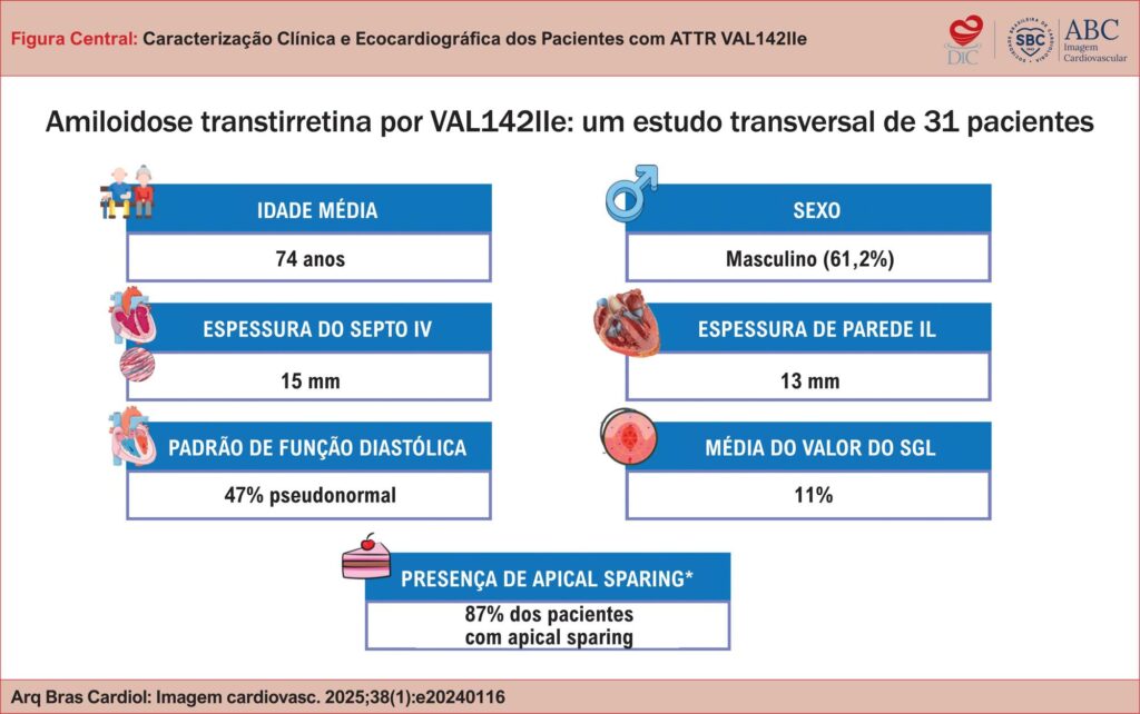 A cardiomiopatia amiloide por transtirretina (TTR) associada à VAL142Ile manifesta-se tipicamente em pacientes na sexta ou sétima décadas de vida, sendo uma das formas mais comuns de amiloidose cardíaca hereditária. Estudo tem como objetivo caracterizar algumas manifestações clínicas, laboratoriais e ecocardiográficas de pacientes com a variante genética VAL142Ile, ajudando a melhorar o conhecimento sobre o comportamento fenotípico dessa variante genética entre nós.