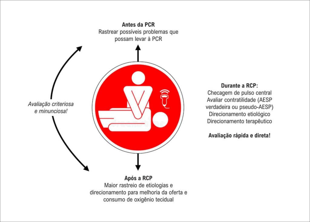 A parada cardiorrespiratória (PCR) é um dos mais prevalentes eventos enfrentados pelos profissionais da saúde. A tentativa da sua reversão, através das manobras de ressuscitação cardiorrespiratória (RCP), ainda apresenta taxas de sucesso muito reduzidas. Atividade elétrica sem pulso (AESP) e assistolia associam-se aos piores desfechos. As principais diretrizes ressaltam a importância de identificar potenciais causas tratáveis que levam à PCR. A ultrassonografia do intensivista e do emergencista (USIE), quando realizada de modo sistematizado e organizado (isto é, sem atrasar ou trazer prejuízo às demais condutas da RCP), pode ser importante para esta mudança de resultados, uma vez que se trata de uma ferramenta diagnóstica e prognóstica, utilizada em um cenário em que o exame físico nem sempre é conclusivo. Neste contexto, as principais aplicabilidades são: diagnóstico de PCR, diagnóstico diferencial entre AESP e pseudo-AESP e diagnóstico etiológico. Vários protocolos foram elaborados para otimizar a realização da USIE cardíaca simultaneamente a cada checagem do pulso central. A USIE pulmonar, abdominal e vascular devem ser realizadas durante as manobras de reanimação, pois não interferem nelas. Além disso, devem ser executadas preferencialmente por um médico capacitado que não esteja participando ativamente na condução das manobras de reanimação, assim mantendo a dinâmica da RCP. A USIE contribui para o diagnóstico, prognóstico e o manejo terapêutico em vítimas de PCR, sobretudo nos casos de AESP e de assistolia; todavia, ainda não há comprovação robusta se o seu uso reduz a mortalidade destes pacientes.