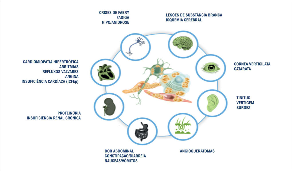 A doença de Fabry (DAF) é um erro inato do metabolismo dos glicoesfingolipídeos, causado pela deficiência da enzima alfa-galactosidase A (alfa-Gal A). Como consequência, ocorre acúmulo lisossomal citoplasmático de globotriaosilceramidas (GB3 e LysoGB3), resultando em manifestações clínicas multissistêmicas. O envolvimento cardiovascular, que pode mimetizar uma cardiomiopatia hipertrófica, representa o principal determinante de morbimortalidade, devido ao desenvolvimento de arritmias, isquemia miocárdica e insuficiência cardíaca. Embora a prevalência da doença seja baixa na população geral, a disponibilidade de terapia de reposição enzimática específica, capaz de modificar sua evolução, destaca a DAF como diagnóstico diferencial relevante entre as cardiomiopatias por depósito. A investigação diagnóstica deve incluir uma avaliação clínica minuciosa, com ênfase na anamnese e no exame físico, além da realização de exames laboratoriais e de imagem, como eletrocardiograma e ecocardiograma. A ressonância magnética cardíaca, utilizando realce tardio com gadolínio e mapas paramétricos T1 e T2, oferece informações adicionais diagnósticas e prognósticas, devendo ser preferencialmente realizada no momento do diagnóstico inicial. A confirmação definitiva é obtida por meio do sequenciamento genético do gene GLA, localizado no braço longo do cromossomo X, permitindo, assim, a definição da abordagem terapêutica mais adequada paracada paciente.