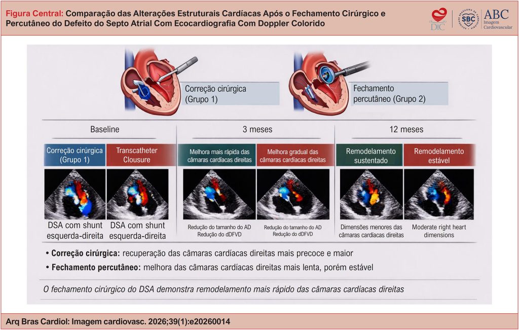 O fechamento cirúrgico do DSA esteve associado a recuperação mais precoce e mais consistente da geometria e da função atrial e ventricular direitas em comparação ao fechamento percutâneo. Esses achados indicam que o fechamento cirúrgico pode oferecer vantagens para pacientes selecionados, particularmente em relação ao remodelamento do coração direito durante o primeiro ano pós-operatório.