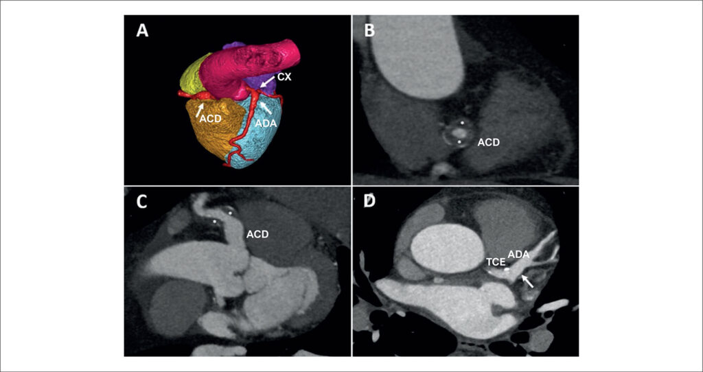 Um paciente de 54 anos, sem histórico médico prévio, foi avaliado na clínica de cardiologia por dor torácica com características atípicas. Devido a uma probabilidade pré-teste de cardiopatia isquêmica de 20%, foi realizada tomografia computadorizada de coronárias, que evidenciou um aneurisma coronário (10 × 11 mm) desde a origem da artéria coronária direita (ACD) até o segmento médio (, seta branca; ). No segmento médio da ACD, havia trombose circunferencial parcial com estenose luminal de 50% ( e ; , asteriscos brancos). O restante da ACD não apresentou obstrução da artéria coronária. Também foi observado um aneurisma de 9 × 9 mm no tronco da artéria coronária esquerda, estendendo-se até a bifurcação e porção proximal da artéria coronária descendente anterior, sem lesões significativas ( e , setas brancas; ). Foi observado também um aneurisma de 5 × 6 mm na artéria circunflexa esquerda proximal, sem lesões coronárias significativas (, seta branca; ). Foi realizada ressonância magnética cardíaca sob estresse com regadenoson, que foi negativa para isquemia induzida. Sorologias e autoanticorpos, também solicitados, foram negativos. Optou-se por iniciar tratamento clínico com ácido acetilsalicílico e atorvastatina. Durante o acompanhamento de 6 meses, o paciente não apresentou desfechos coronários e permaneceu assintomático.