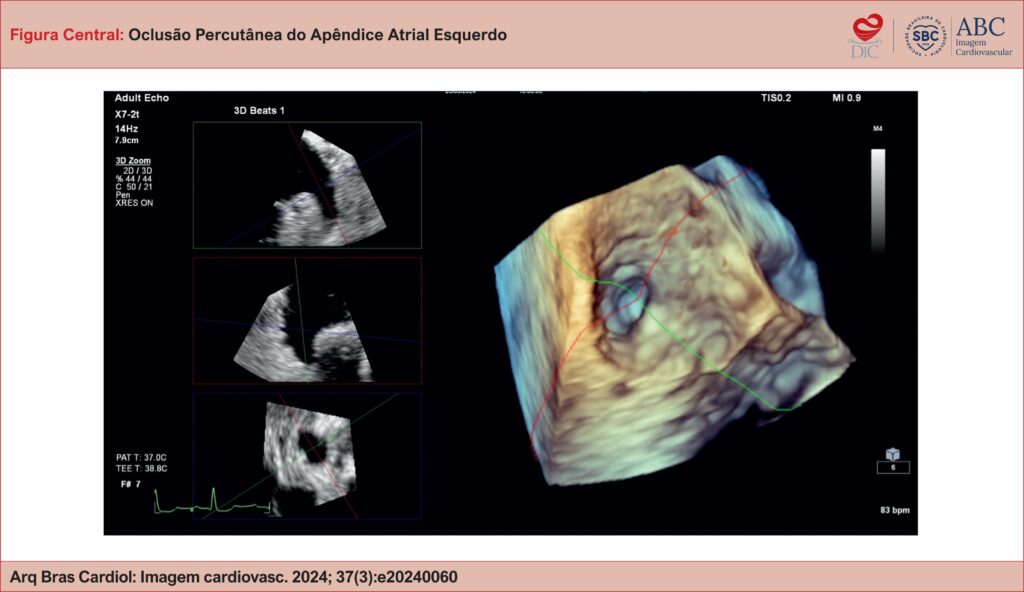 A oclusão percutânea de apêndice atrial esquerdo (AAE) é uma alternativa à anticoagulação oral para pacientes com fibrilação atrial (FA) ou flutter, com risco elevado para eventos cardioembólicos, porém com histórico ou risco elevado de sangramento. Nos últimos anos, têm sido desenvolvidas novas gerações de dispositivos oclusores, que, somadas à maior experiência dos operadores, tornaram o procedimento seguro quando bem indicado. O estudo ecocardiográfico transesofágico tem papel central na avaliação da morfologia do AAE, seleção do tamanho dos dispositivos, assim como no monitoramento com imagem durante o procedimento cardiovascular estrutural.