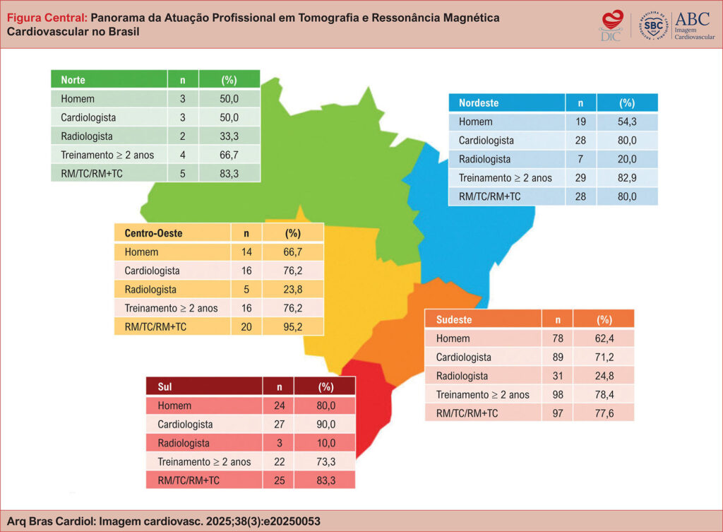 Um total de 219 profissionais responderam ao questionário, sendo 139 (63,8%) do sexo masculino, 161 (73,9%) cardiologistas e 46 (21,1%) radiologistas. De acordo com a região, nota-se: Sudeste com 125 profissionais (57,3%), Nordeste com 35 (16,1%), Sul com 30 (13,8%), Centro-Oeste com 22 (10,1%) e Norte com 6 (2,8%). O perfil desses profissionais nas diferentes regiões do país é semelhante, não se observando diferenças estatísticas com relação à proporção de homens (p = 0,2451), cardiologistas (p = 0,1325), radiologistas (p = 0,4564), tempo de treinamento > 2 anos (p = 0,8519). O Sudeste apresentou o maior número absoluto de exames e a região Norte o menor número de exames.