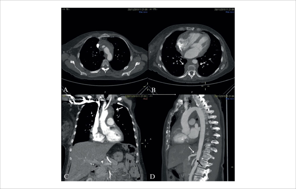 A mediastinite fibrosante (MF) é uma condição rara caracterizada pela proliferação de tecido fibrótico no mediastino, apresentando-se como uma massa concentrada ou infiltração difusa., As condições clínicas podem variar de benignidade a obstrução de estruturas mediastinais vitais, como vasos, vias aéreas e o esôfago. As queixas comuns são tosse, dispneia, infecção pulmonar recorrente, hemoptise e dor pleurítica. O envolvimento pericárdico não é relatado com frequência na literatura. Neste relato, descrevemos um caso raro de derrame pericárdico importante com tamponamento cardíaco como apresentação inicial de MF em uma paciente com câncer.