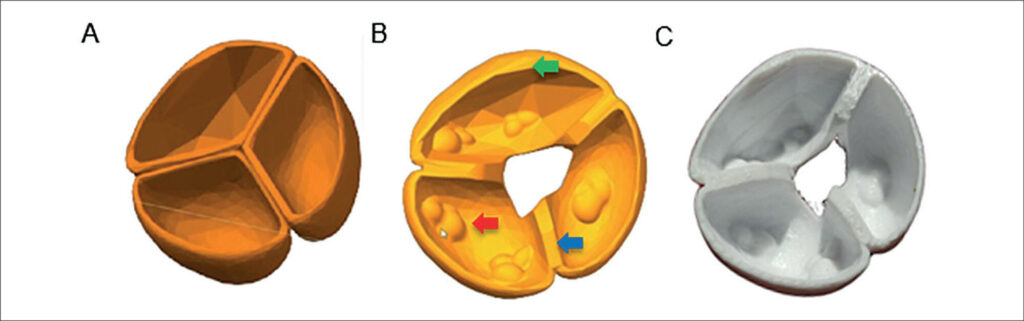Foi impresso um protótipo cardíaco no qual as válvulas aórtica e mitral foram modeladas para representar as alterações morfofisiológicas estenose aórtica e insuficiência mitral, respectivamente.