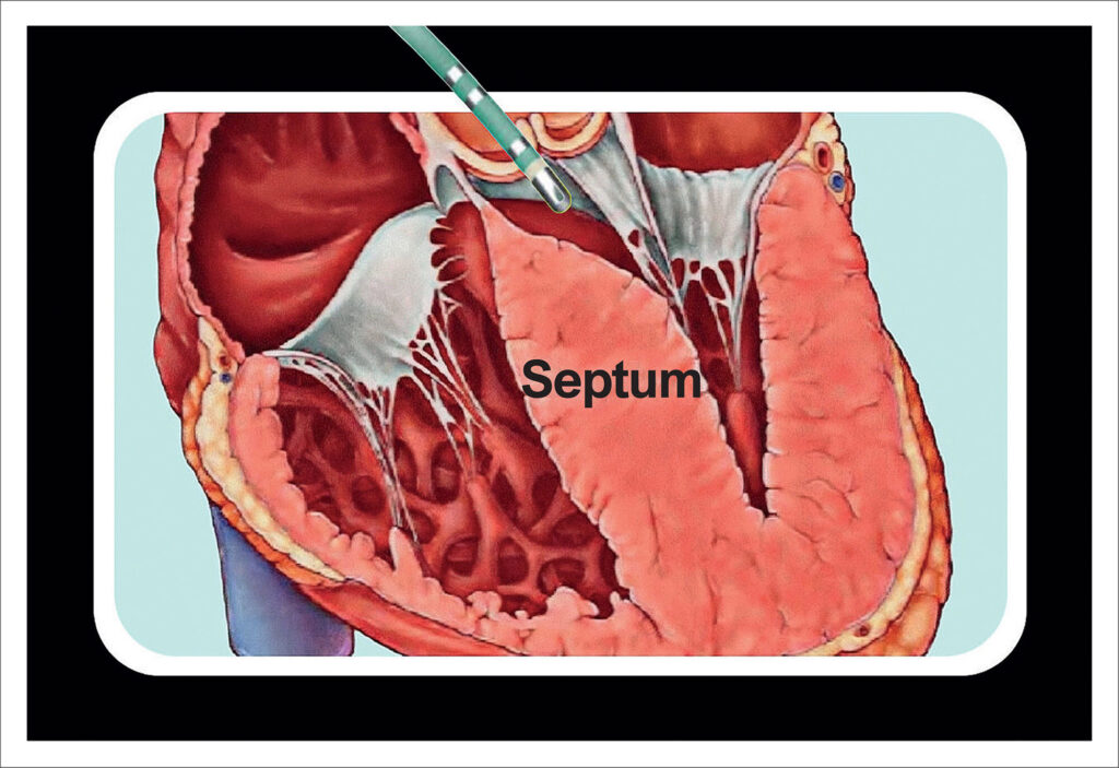 The indication for invasive treatment aimed at reducing the intraventricular gradient is reserved for symptomatic patients —those who are refractory to medical therapy — with a gradient ≥ 50 mmHg. Common interventional therapies for this condition include surgical myectomy or, in a less invasive approach, alcohol septal ablation of coronary septal branches. However, these interventions have shown highly variable outcomes in the literature and remain infrequently used in clinical practice.,